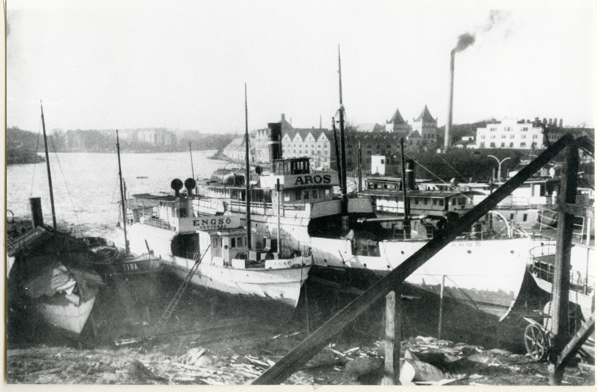 "Aros" och "Engsö" upplagda för vårutrusning vid Bergsunds varv vid Hornstull, 1927.