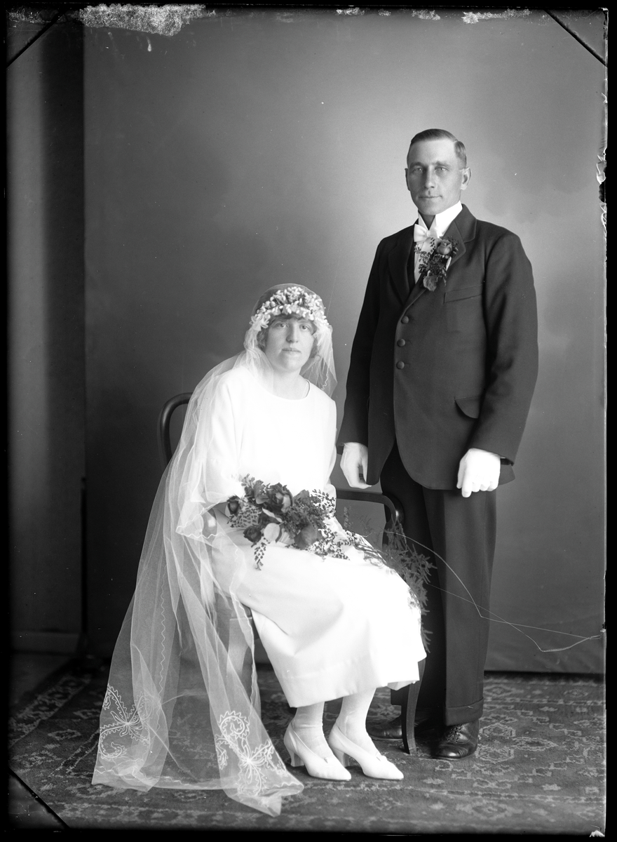 Grupporträtt, brudpar, Alfred Johansson, Enskede, Skattmästarevägen 3, Stockholm.