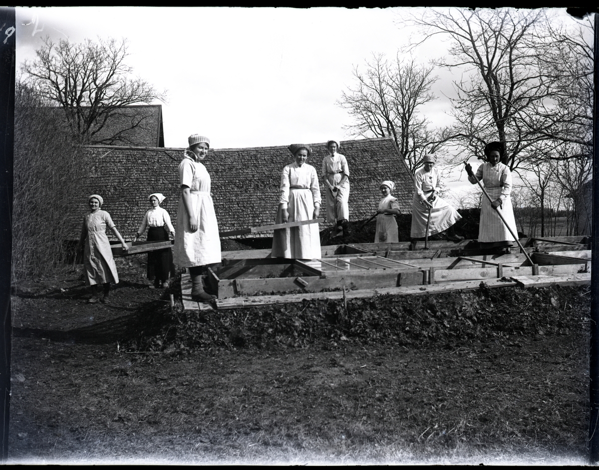 Åtta kvinnor arbetar i köksträdgården utanför Husmodersskolan.