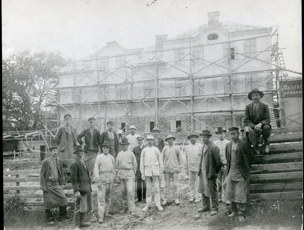 Byggnadsarbetare utanför byggnad med byggnadsställningar, på Kristinagatan. C:a 1900.