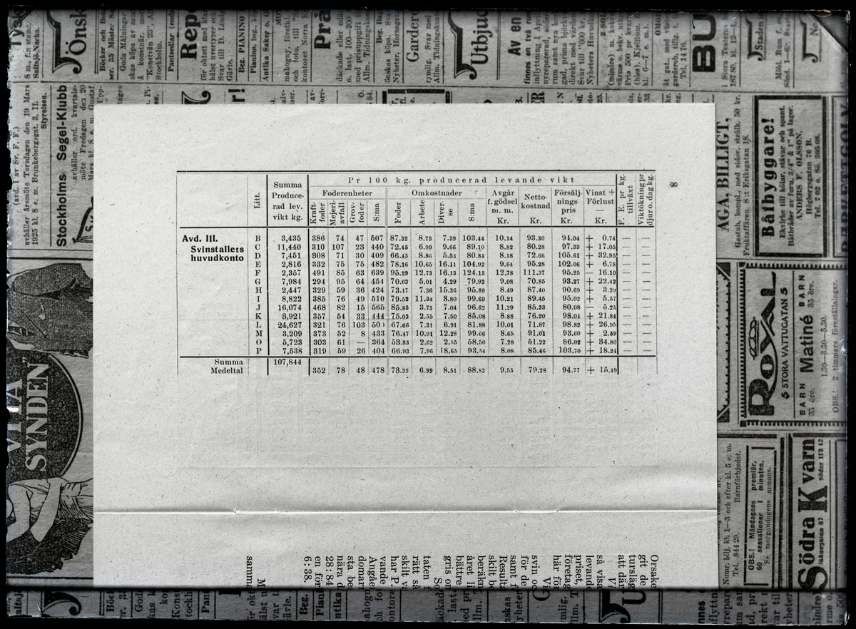 Tabell över vinst/förlust vid svinproduktion. (skiopt.). Dir Celsing.