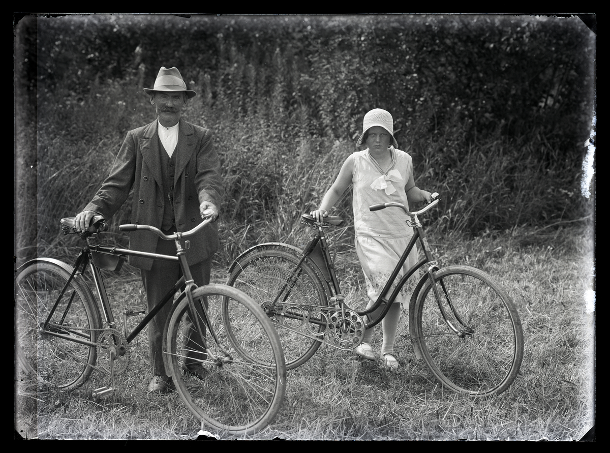 Grupporträtt, två personer med cyklar. Lind, Skällby, Hallstahammar.