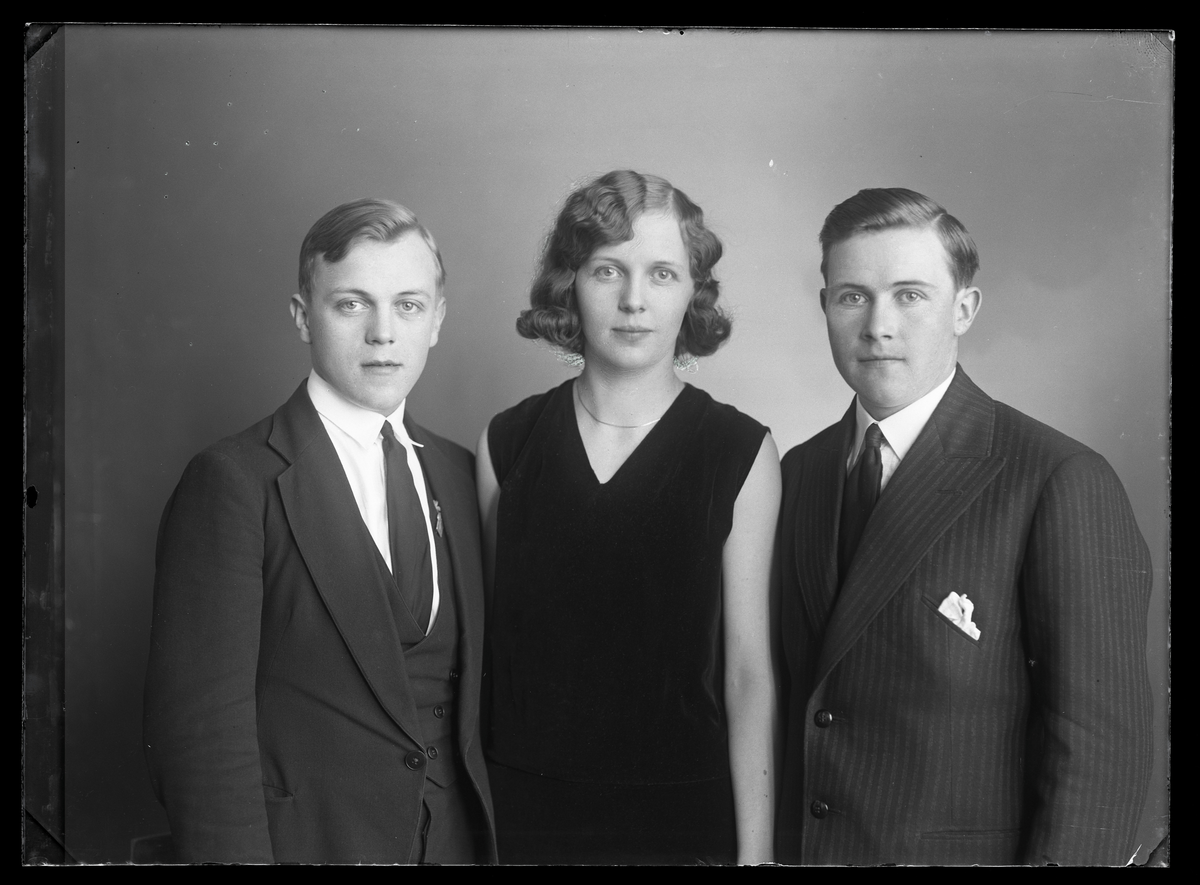 Grupporträtt, tre personer. Oskar Holmkvist, Box 1150, Hallstahammar.