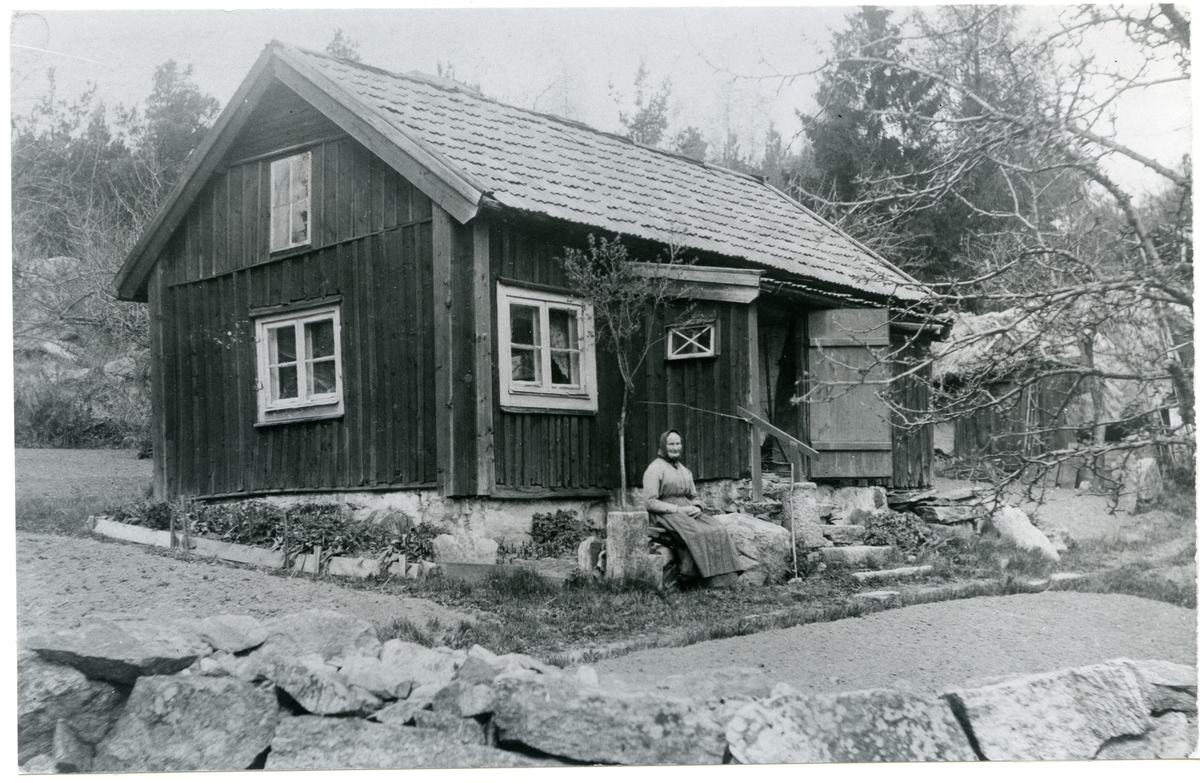 Stenbo. Anna Margareta Källström utanför sin stuga, c:a 1900-1910.
