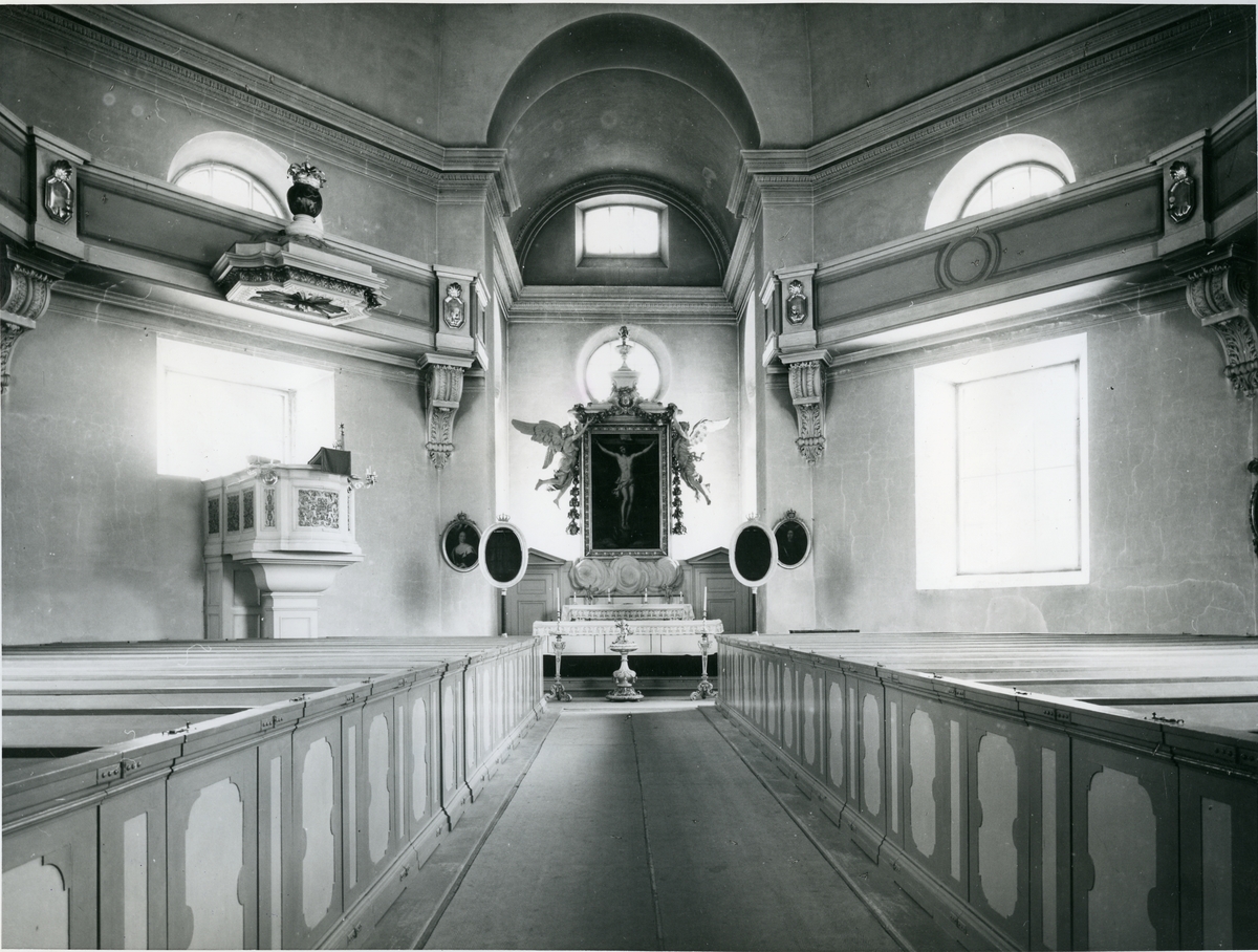 Interiör av Kung Karls kyrka, med kyrkbänkar, predikstol, psalmtavlor, altare, altartavla m.m.
