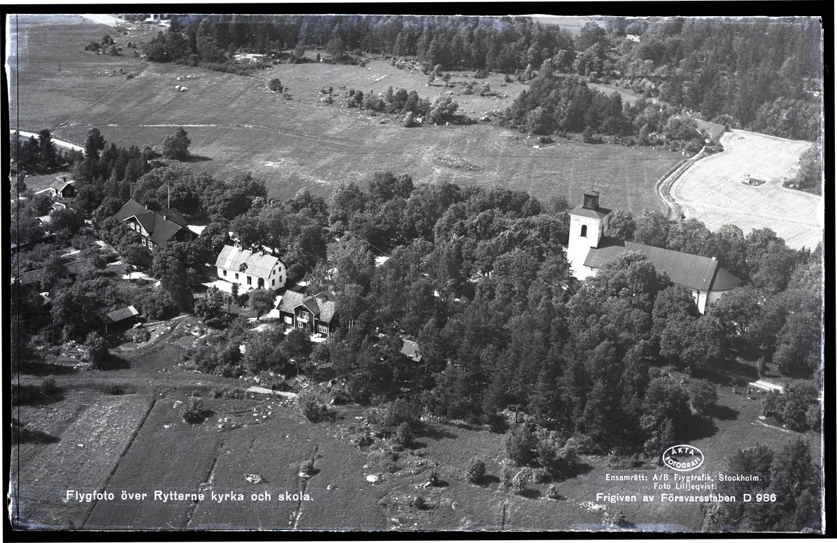 Flygfoto över Rytterne kyrka och Rytterne skola.