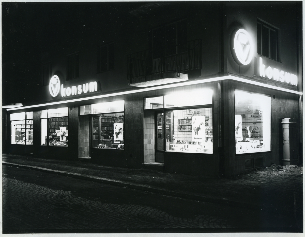 Skyltfönster till Konsumbutik, Stora gatan 84. 1940-talet.