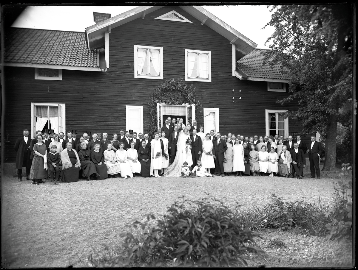 Grupporträtt, bröllop, framför hus. Bergström, Brunna