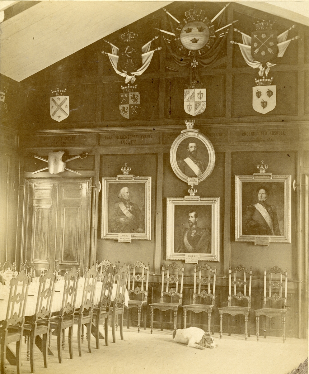 Kungatavlor, vapensköldar, värjor, salsbord, stolar.