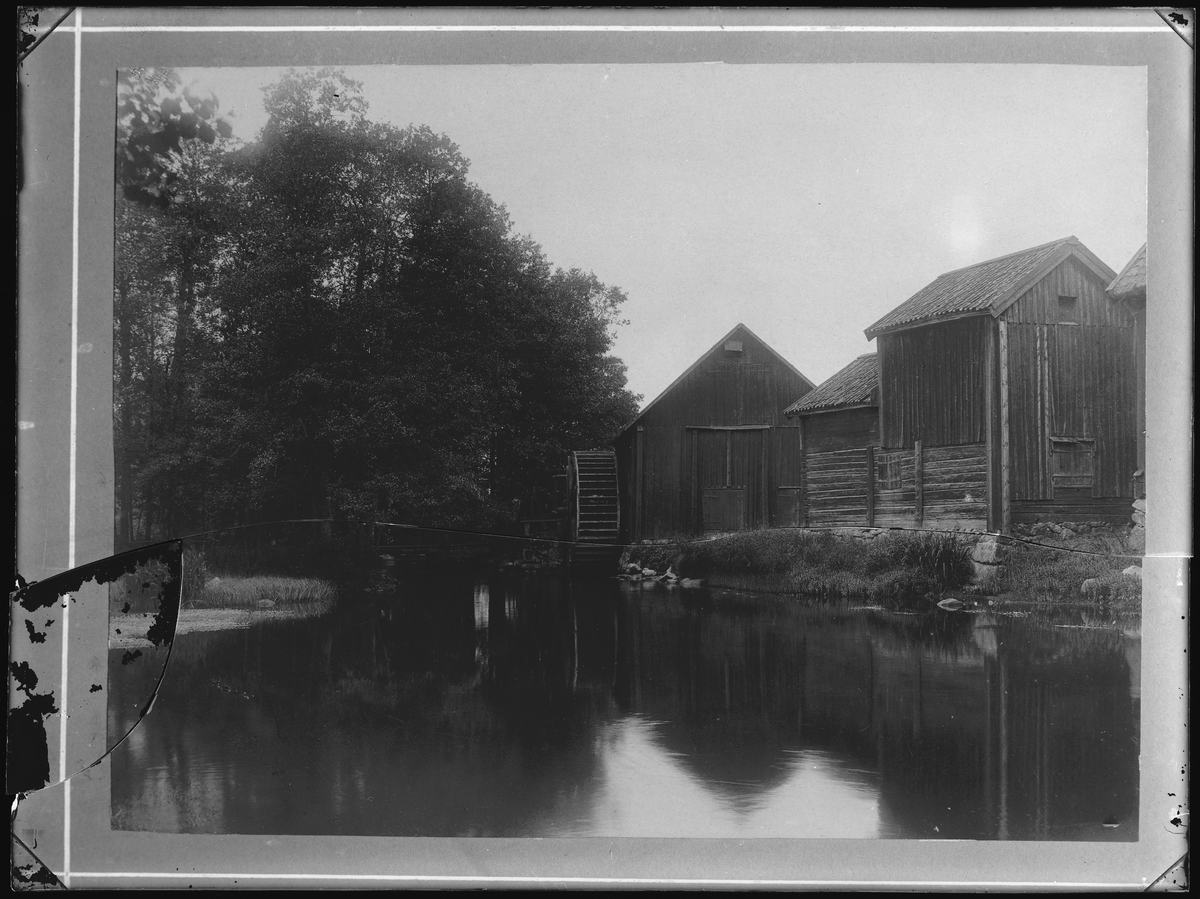 Byggnader samt kvarnhjul och damm. Reprobild.