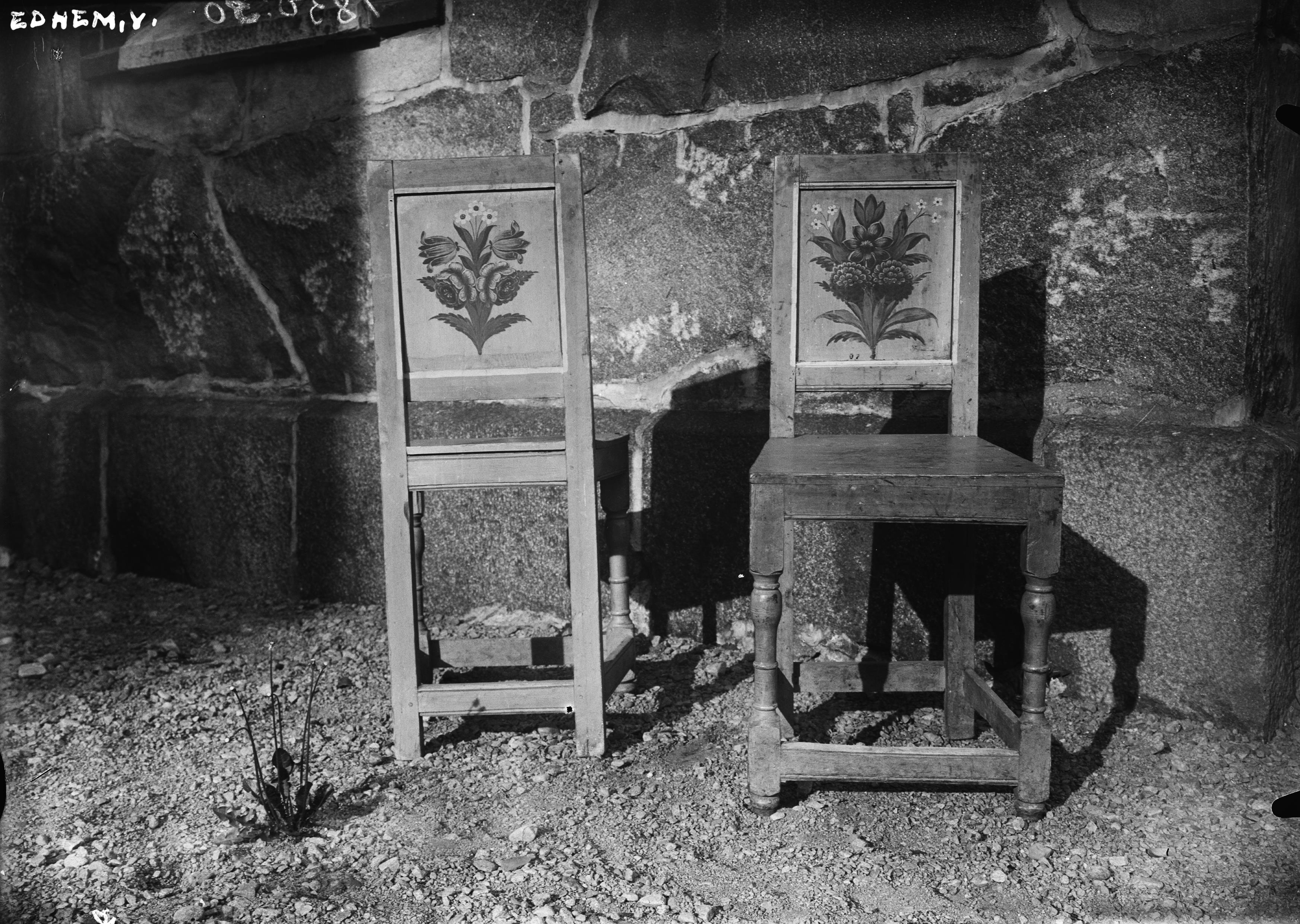 Stolar, trä, två stycken, blommor målade på ryggstyckenas fram- och baksidor, början av 1700-talet. Snabbinv.