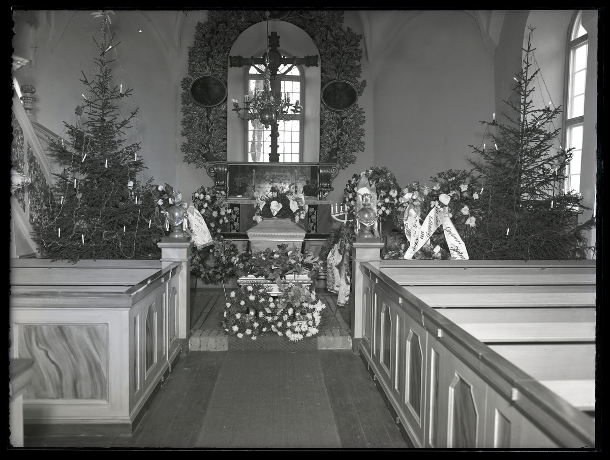 Interiör i kyrka, begravning, kista. O. Bergström, Herrevad.