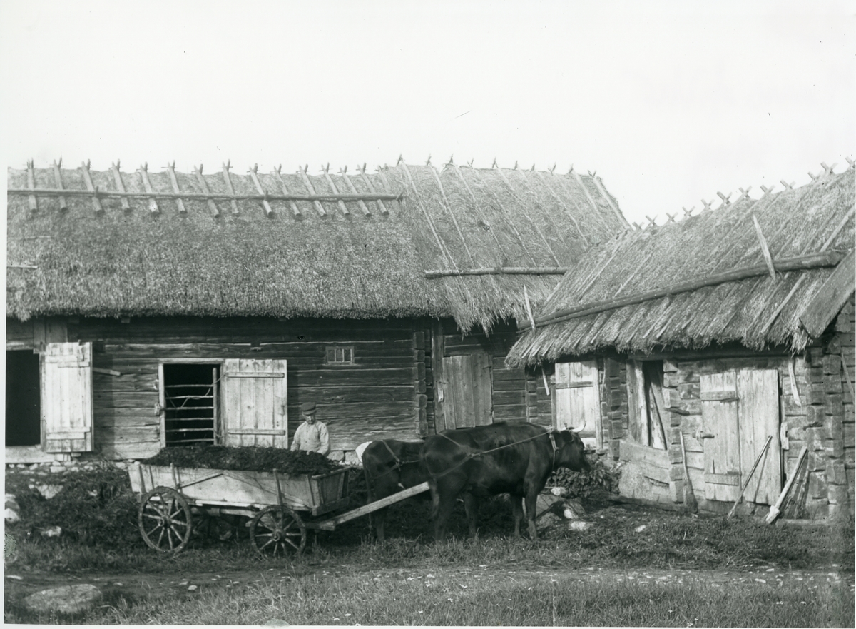 Skästa. Vagn lastad med dynga, förspänd med två oxar. 1910.