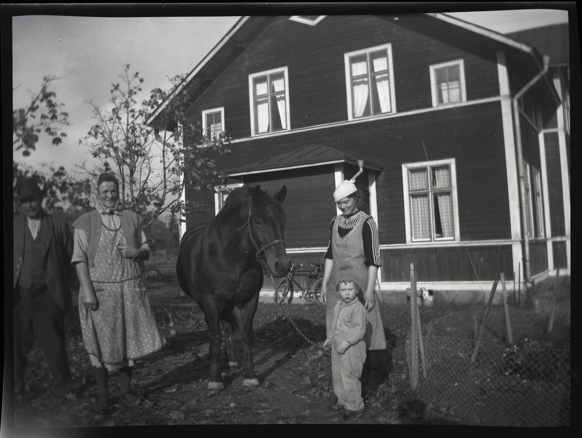 Grupporträtt, personer och häst, stående framför husgavel.