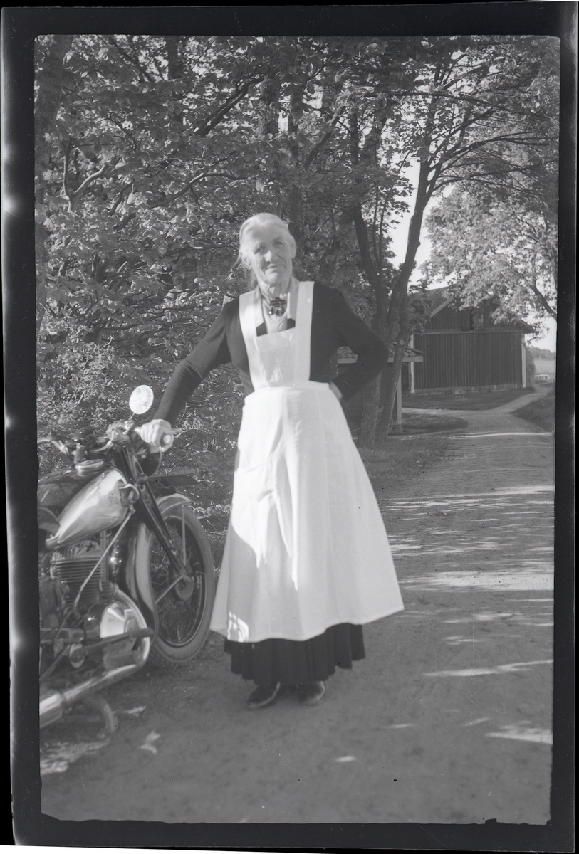 Äldre kvinna iklädd svart klänning och vitt förkläde.