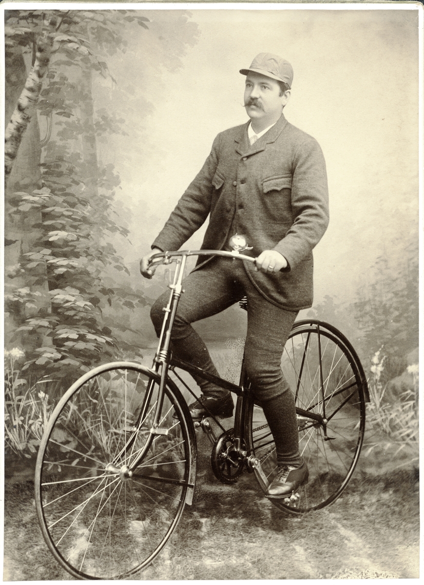 Porträttfoto. Fabrikör Lars Uppling på cykel. C:a 1895-1900.