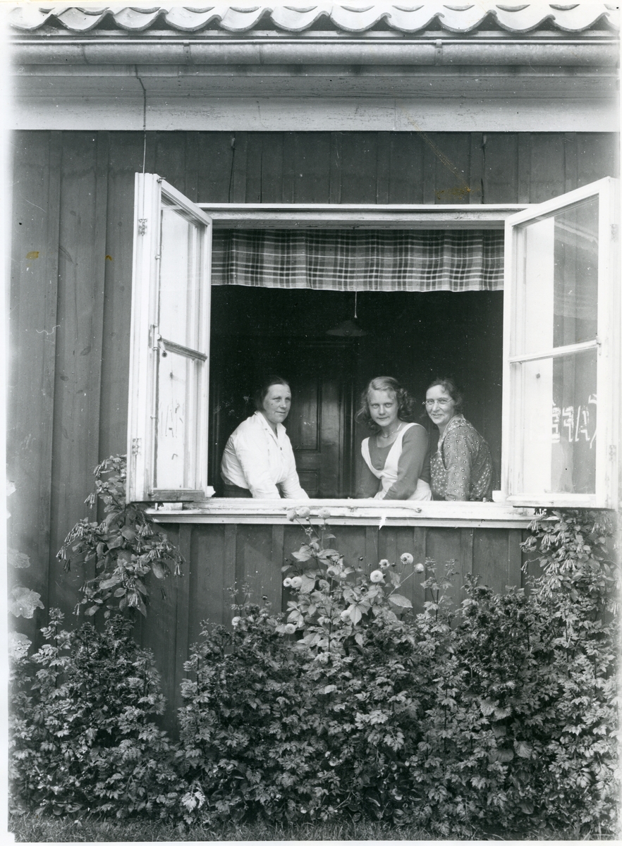 Tre kvinnor i hamnserveringens köksfönster, 1930-talet.