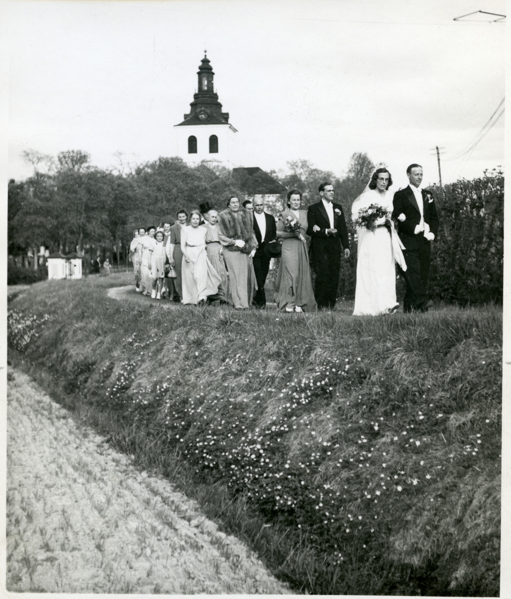 Tågande brudpar och gäster efter bröllop i Västerfärnebo kyrka, 1948.