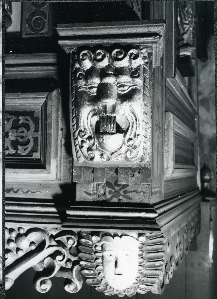 Tortuna kyrka. Lejonmaskaron på predikstolen, 1973.