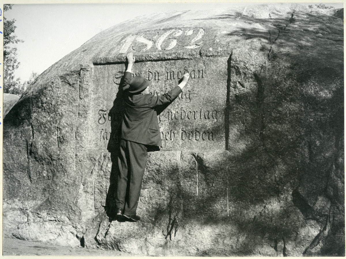 Man klättrar på Sam Lidmans första minnessten, c:a 1930-tal.