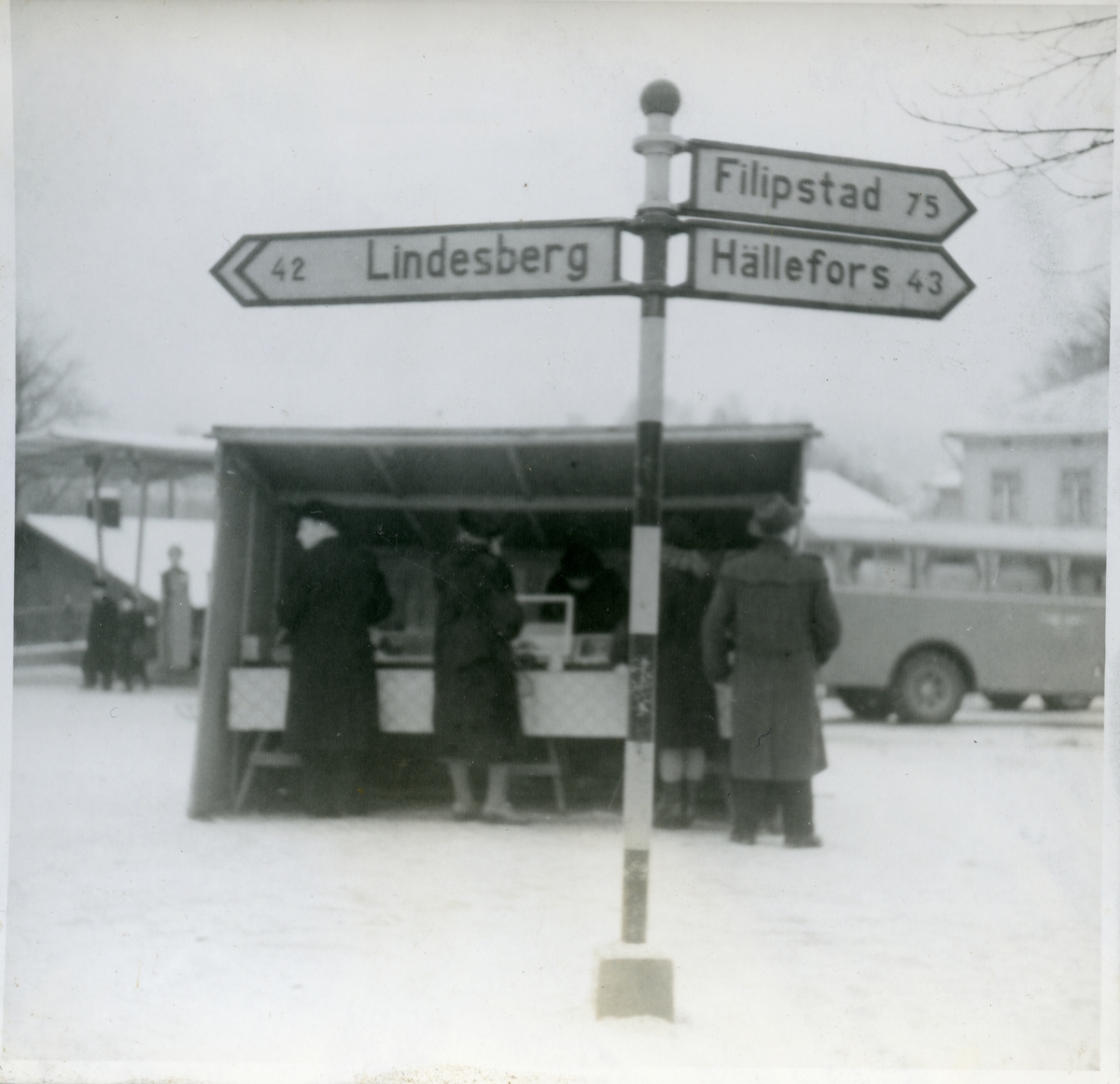 Folkmarknad. Torgstånd och vägskylt.