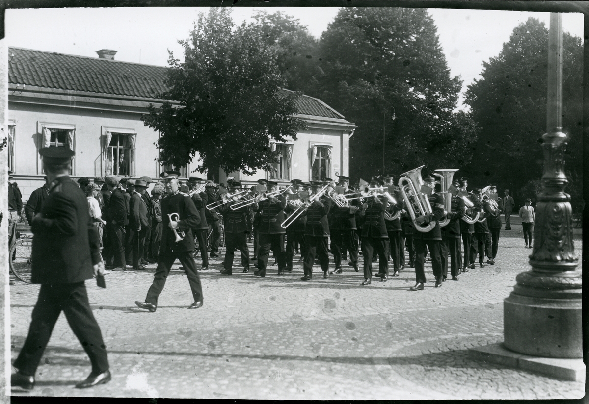 Frälsningsarmén Marscherar över Fiskartorget spelande blåsinstrument. 1920-1930-tal.