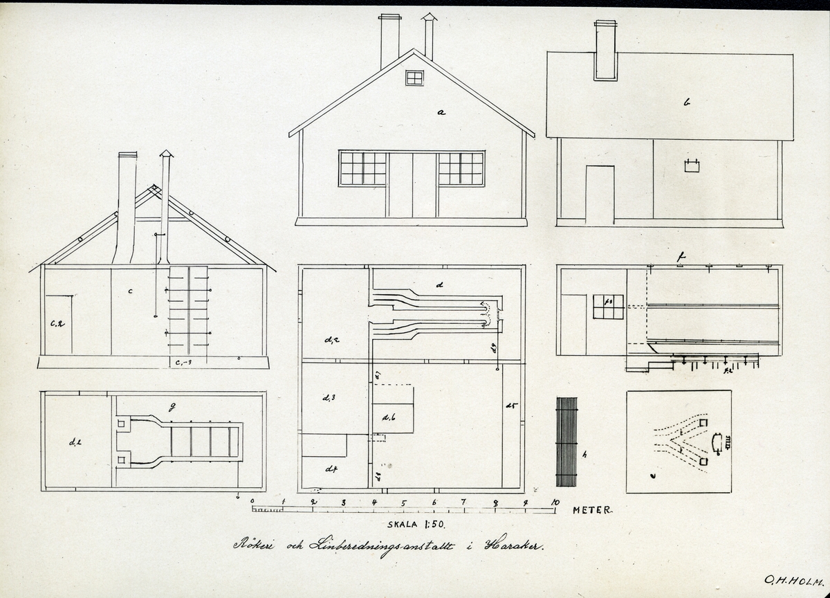 Hemslöjden, ritning föreställande rökeri och linberedningsanstalt i Haraker.