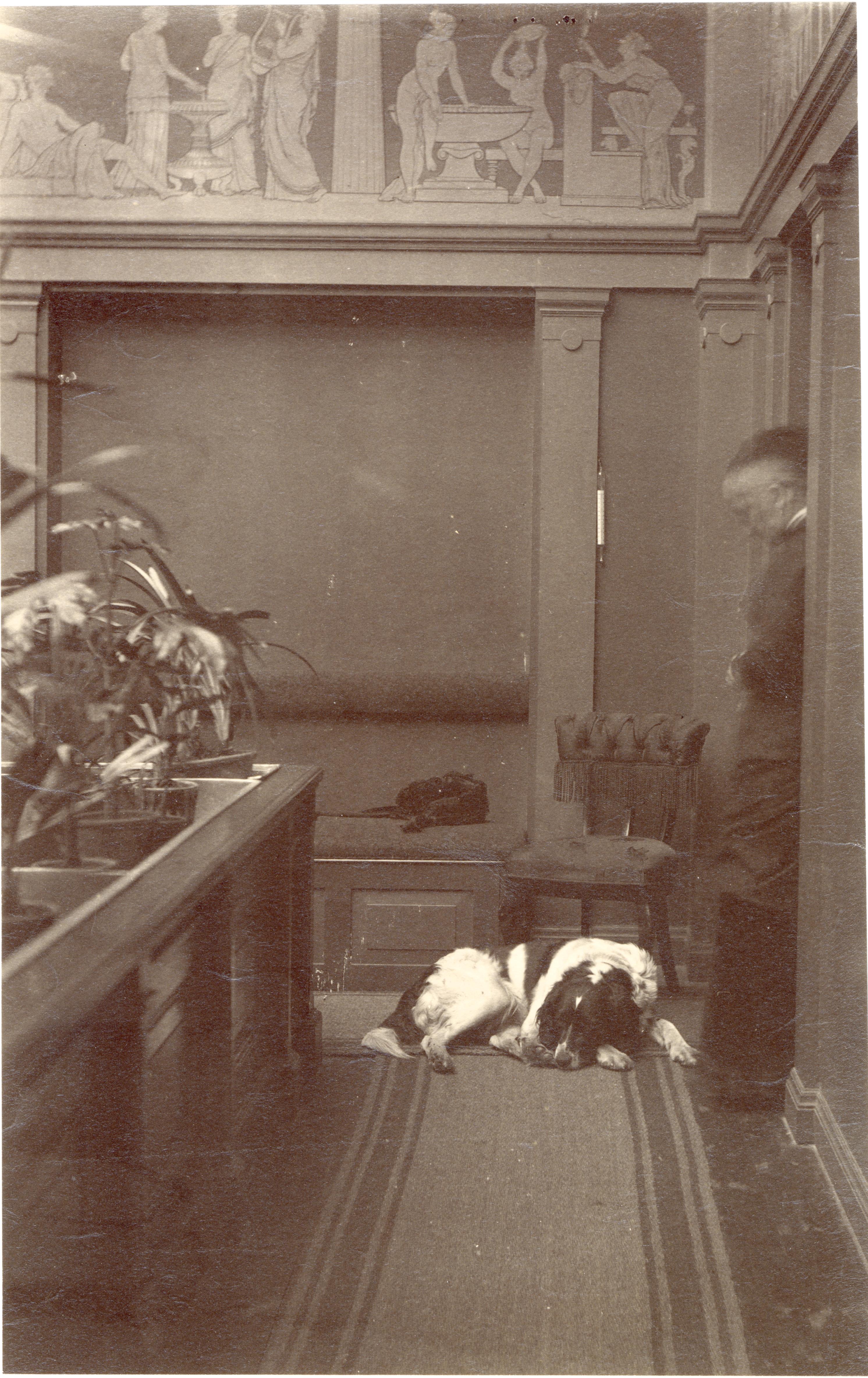 Interiör från Curmans villa, med bland annat en liggande hund. Byggnaden inspirerades av arkitekt Karl Friedrich Schinkel och uppfördes 1880-81. Det är i romerskt lantstil.
