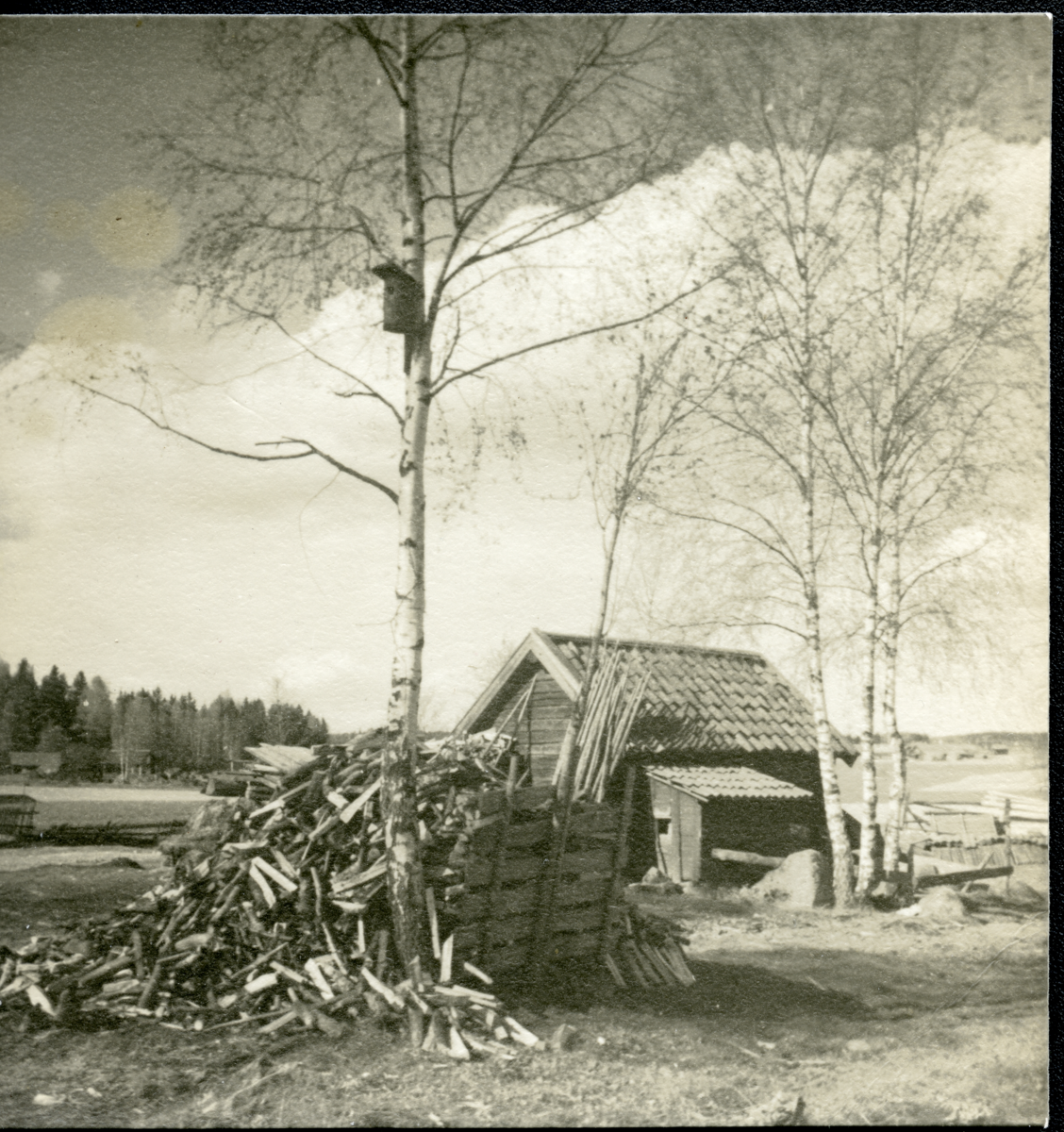 Uthus, björk med fågelholk och med en stor hög ved nedanför.