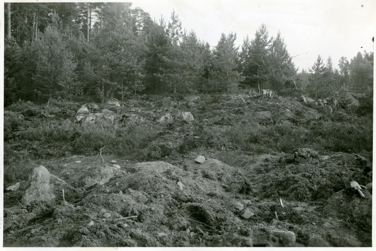 Alvesta nr 3, fornlämningar nr 8, 9, 13 9 och 16 från nordväst efter att grästorv och ljung bortskalats. 1951.