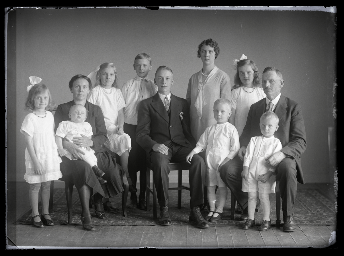 Grupporträtt, elva personer. G. Karlsson, Bäcklunda, Hallstahammar.
