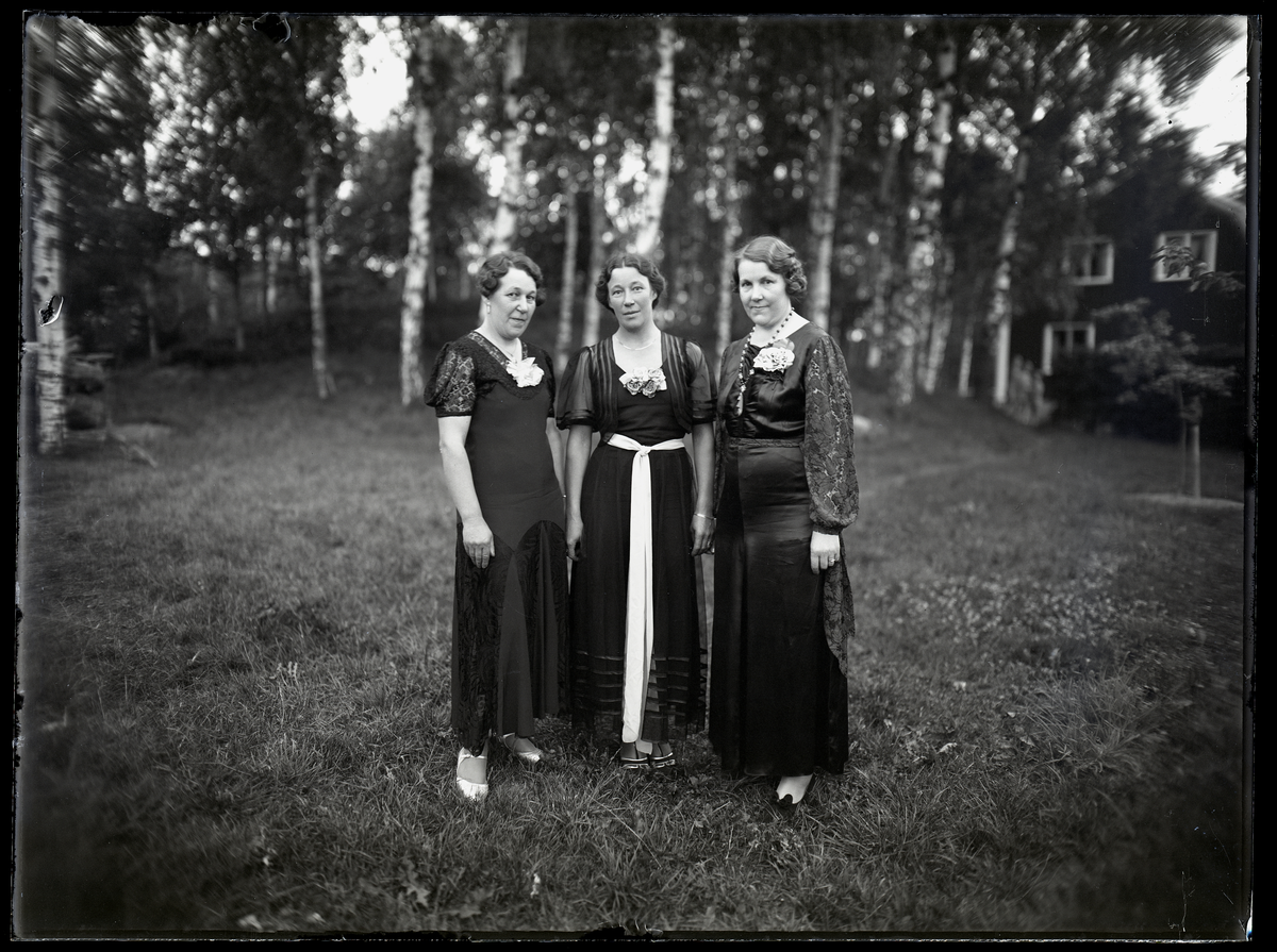 Grupporträtt. Tre kvinnor utomhus. Fru Gartz.