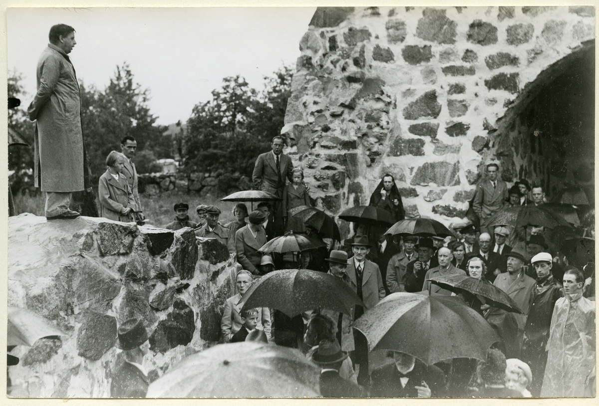Sven Drakenberg och folksamling vid Lilla Rytterne kyrkoruin.