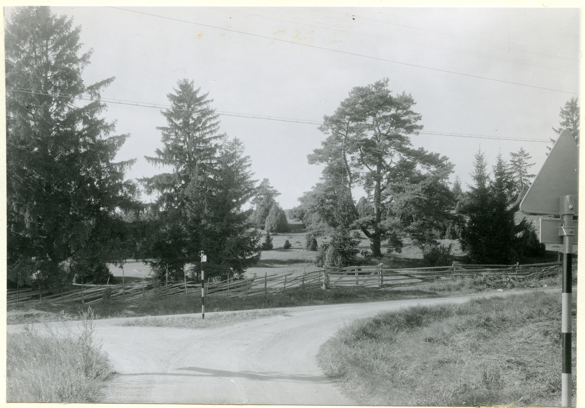 Landsvägkorsning med utsikt mot fornlämningsområde.