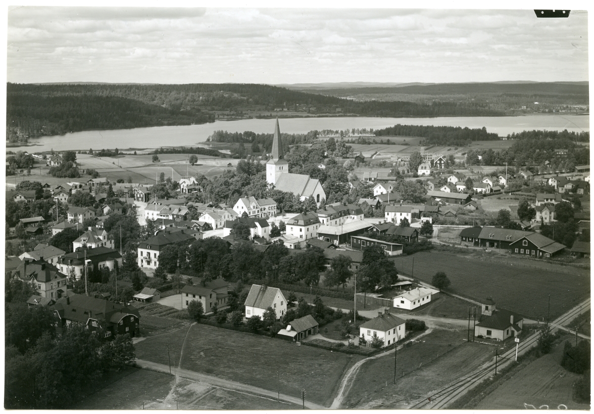 Titel: Norberg sn, Norberg. Flygfoto över Norberg, med kyrkan. 1932.
