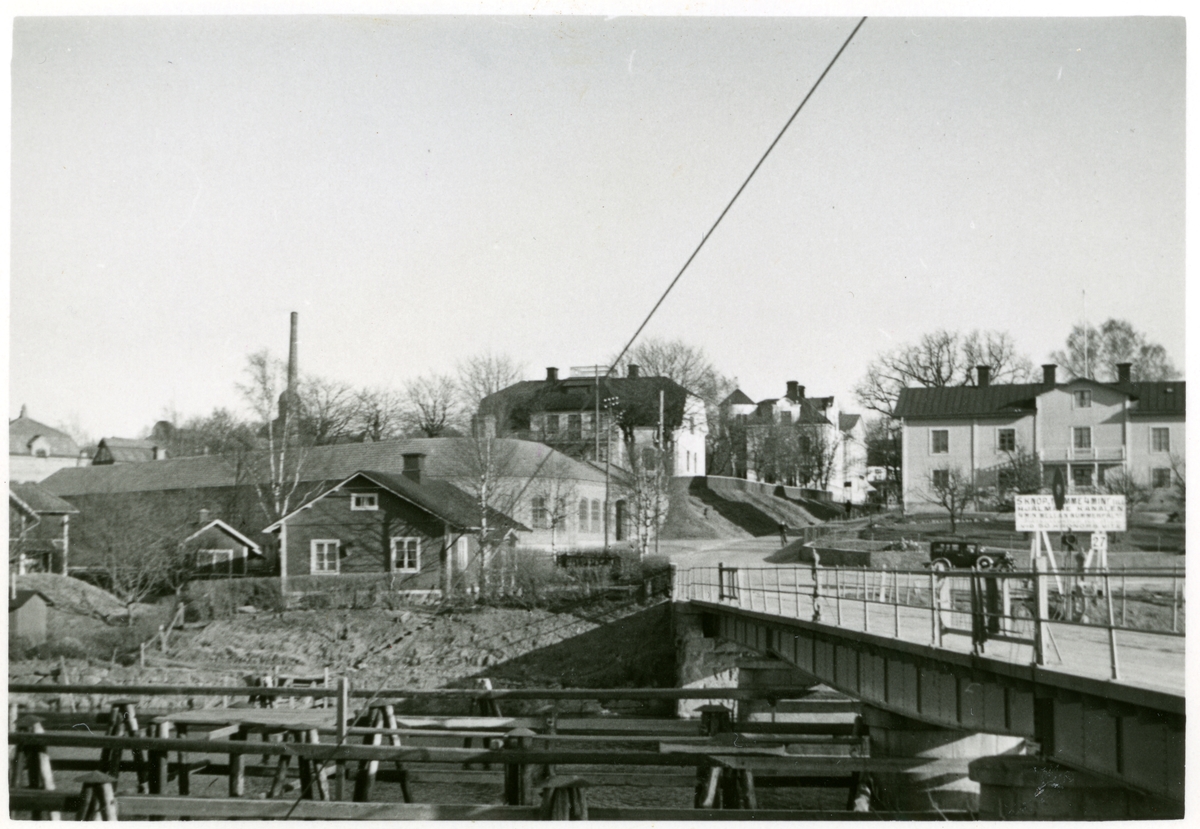 Järnvägsbron med kvarteren Gjutaren och Drotten i bakgrunden.