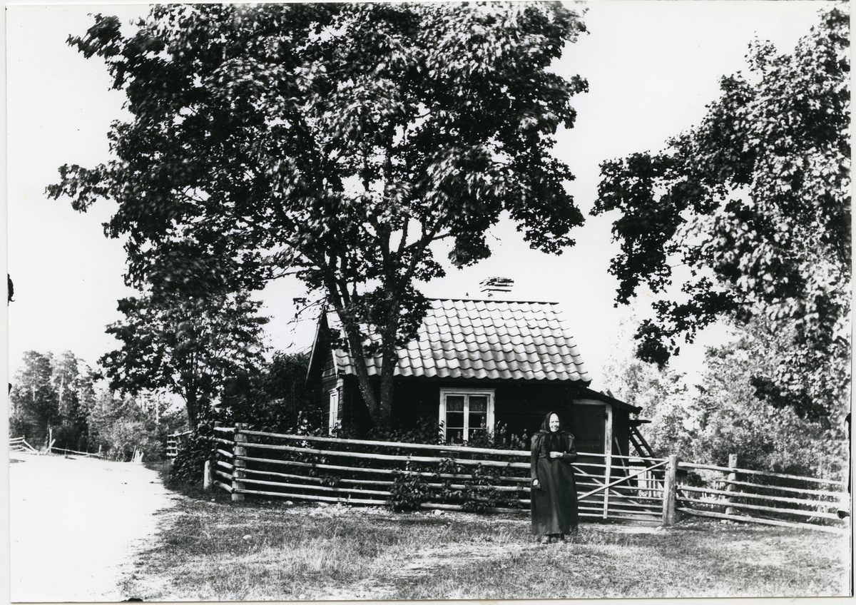 Hedbron. "Hebrons backe", c:a 1910. Äldre kvinna stående vid staketet framför bostaden.