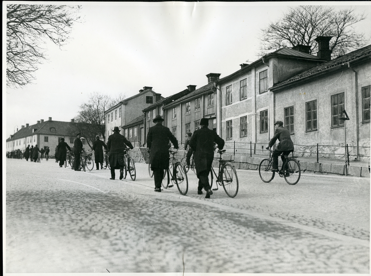 En större grupp cyklister på väg uppför Oxbacken. Troligen 1930-tal.