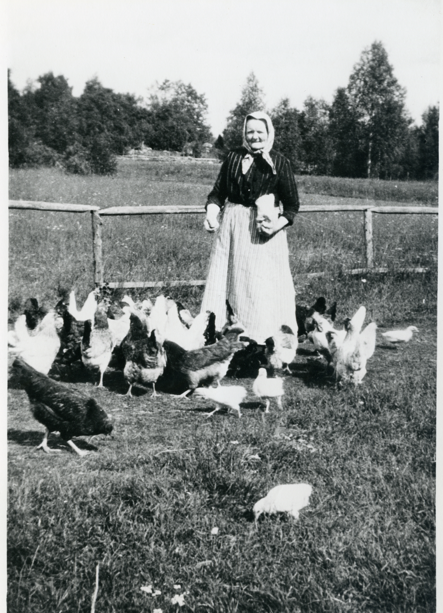 Fru Anna Jansson matar hönsen, 1910-talet.