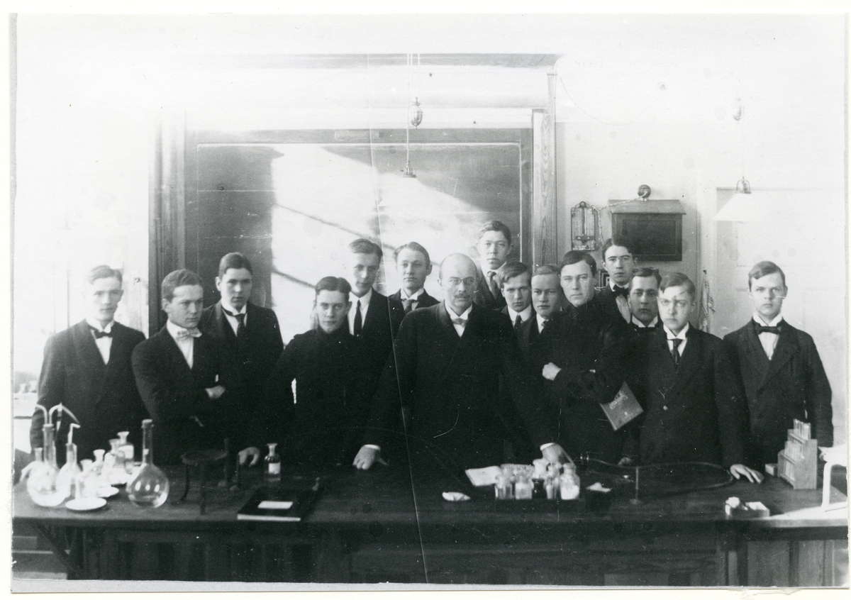 Rudbeckianska skolan (Läroverket). Klass R III C år 1915-1916 med lektor Floderus på kemilektion.