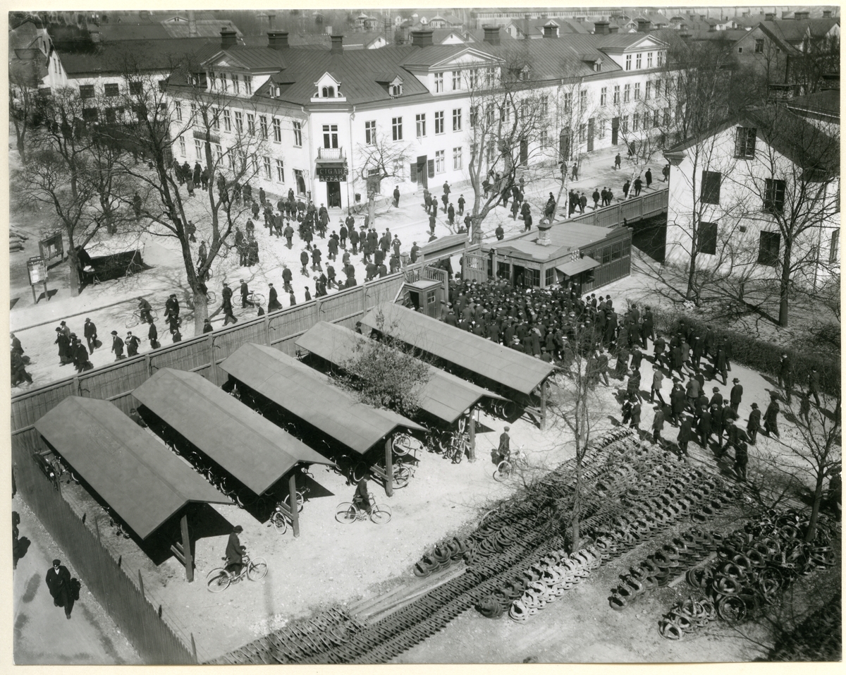 Mimerporten och cykelparkeringen. Folk väller ut genom porten.