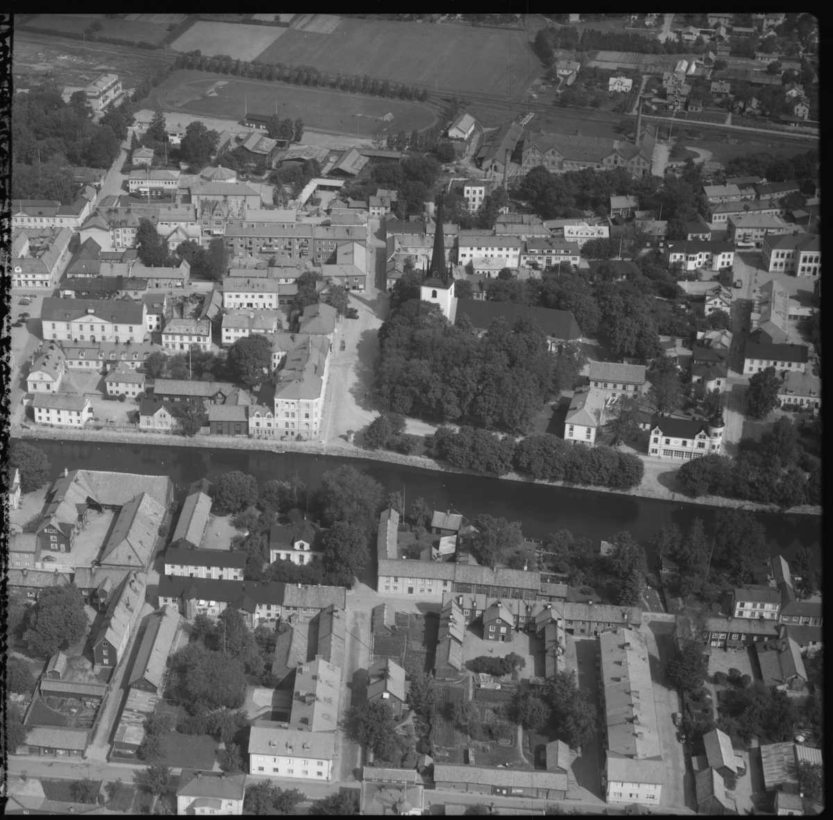 Flygfoto över Arboga centrum, med bland annat AB Arboga Margarinfabrik.