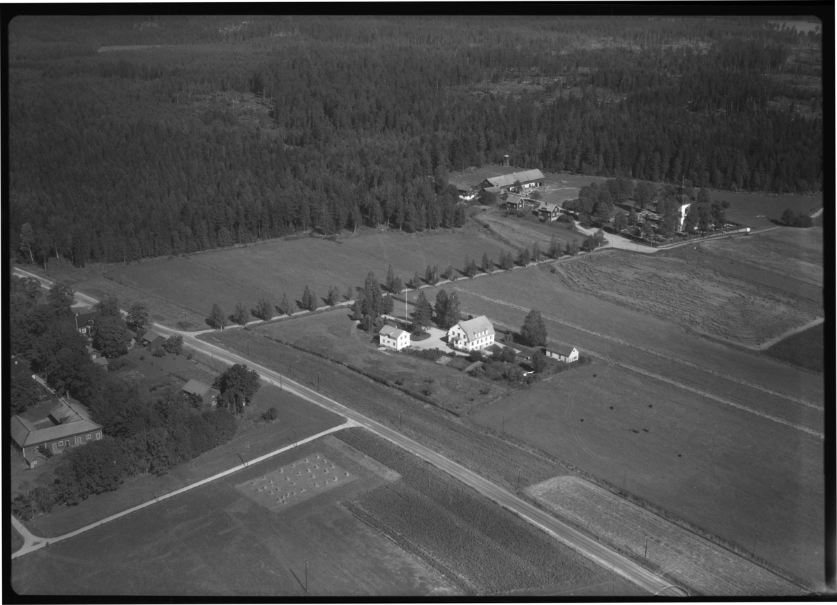 Flygfoto över Västervåla, med Västervåla kyrka i bakgrunden.