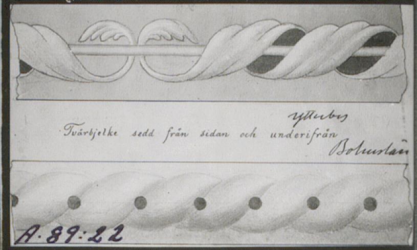 "Tvärbjälke sedd från sidan och underifrån". Akvarell från 1800-talets senare hälft. Fotografi av original.