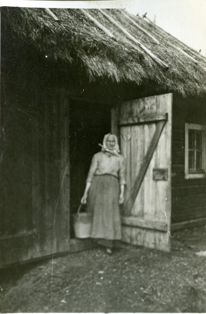 "Farmor". Kvinnan står med hink i handen i dörröppningen till den halmtakstäckta ladugården.