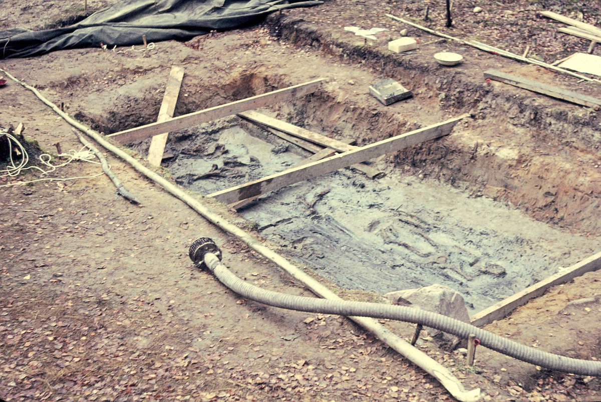 Norsa RAÄ 131, grav 1. Graven, hästskelettet i bakgrunden. Skelettet av en man i förgrunden. 1964.