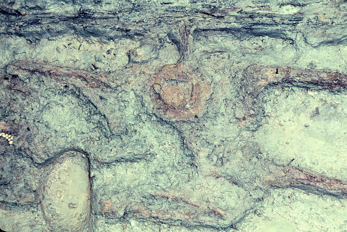Norsa RAÄ 131, grav 1. Mannens skelett med sköldbuckla ovanpå buken. 1964.