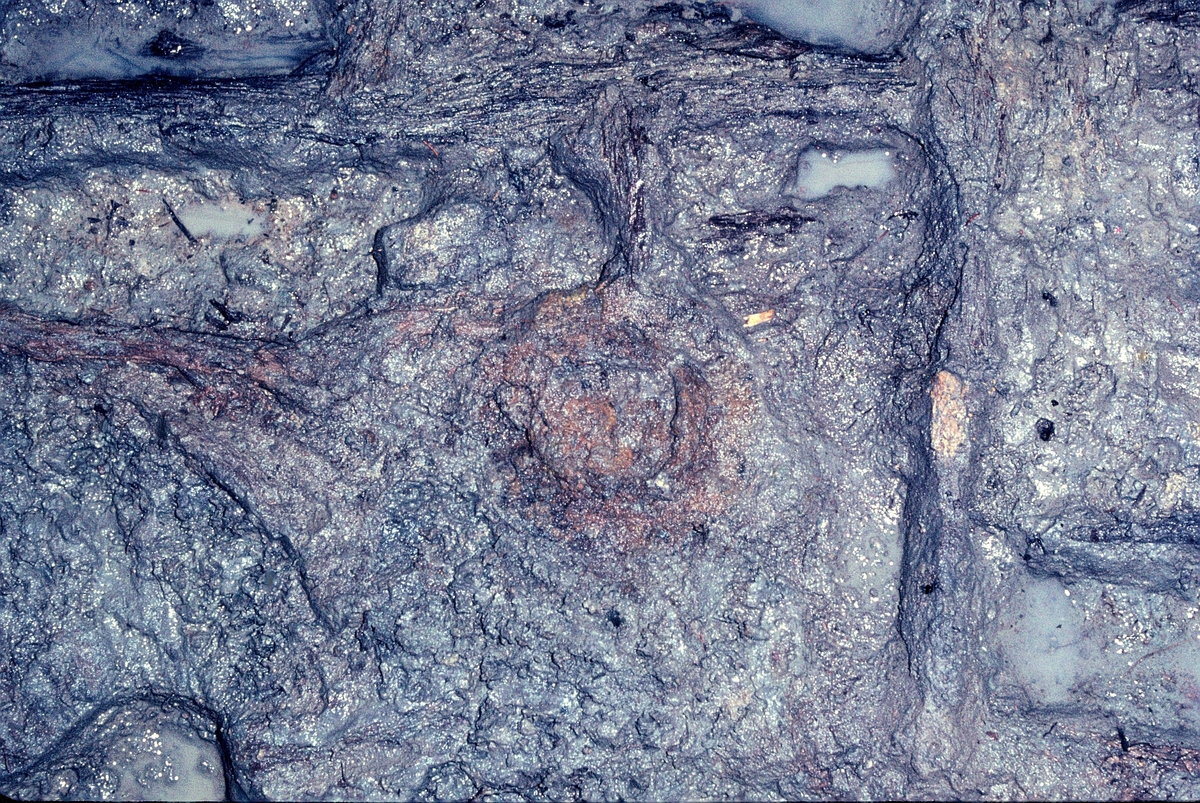 Norsa RAÄ 131, grav 1. Mannens skelett med sköldbuckla ovanpå buken. 1964.