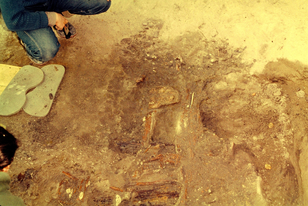 Norsa RAÄ 131, grav 1. Mannens kranium och bröstkorg m.m. in situ. 1964.