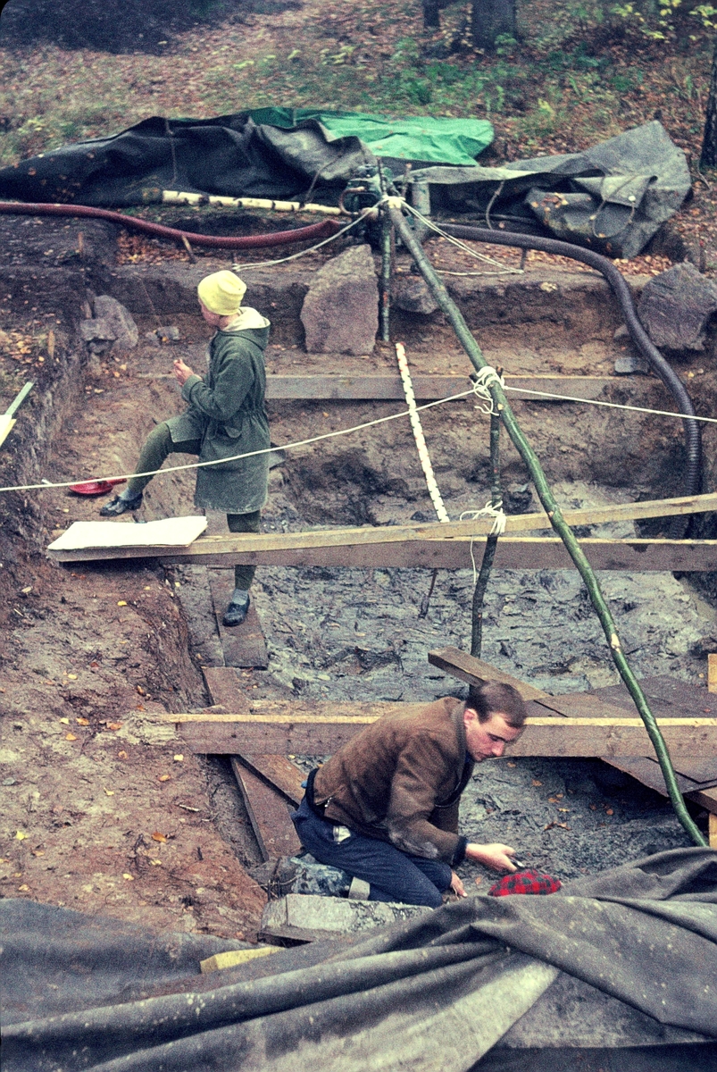Norsa RAÄ 131, grav 1. Else Nordahl och en okänd man arbetar med utgrävningen av graven. 1964.